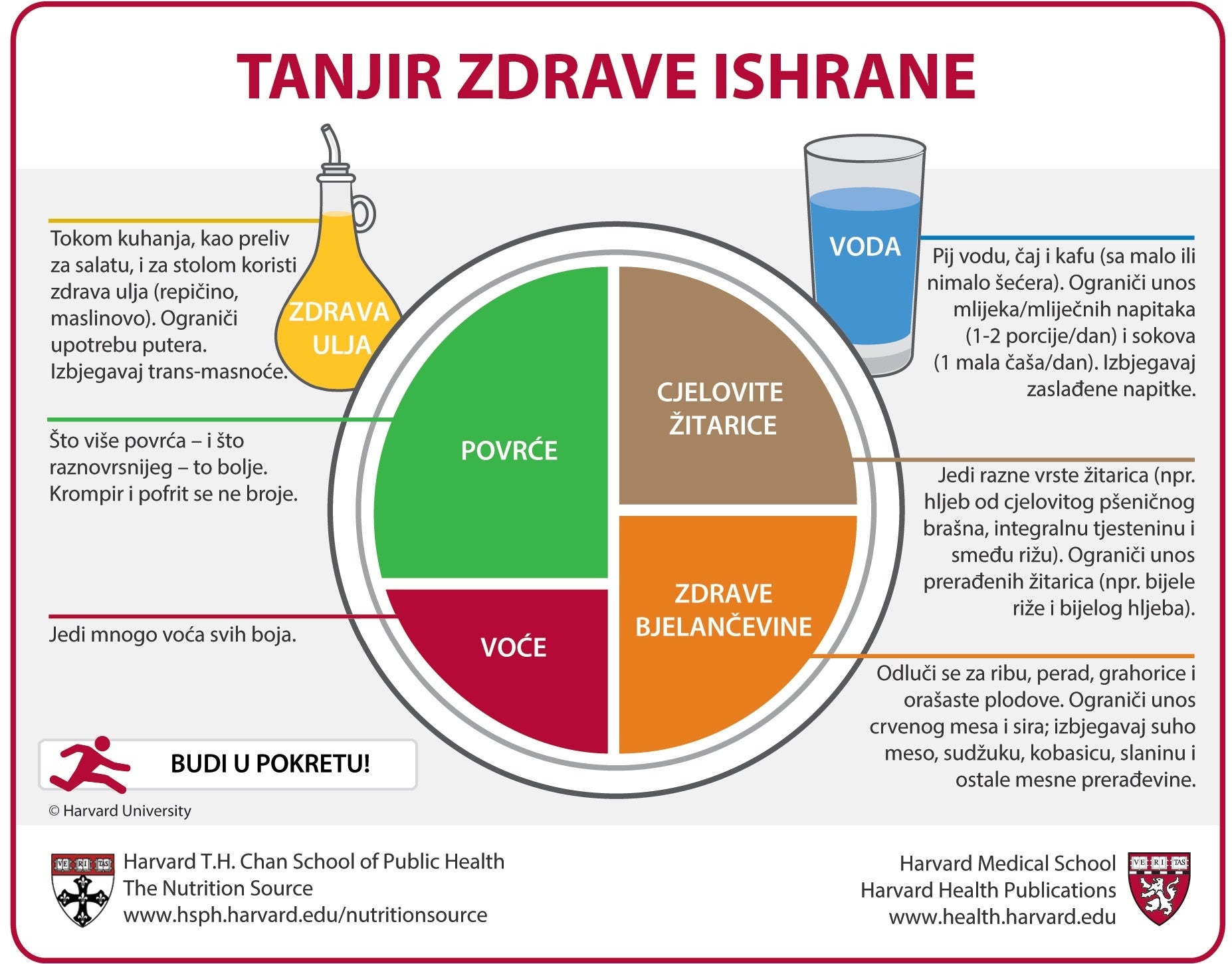 Tanjir zdrave ishrane sastavila je grupa stručnjaka nutricionista iz Škole javnog zdravstva Univerziteta Harvard i urednika zdravstvenih publikacija pri Harvardu, kako bi služio kao vodič za pripremu zdravih, balansiranih obroka – kako onih na tanjiru, tako i onih spakovanih za ručak izvan kuće. Zalijepite ga na frižider kao dnevni podsjetnik za pripremu zdravih, balansiranih obroka!