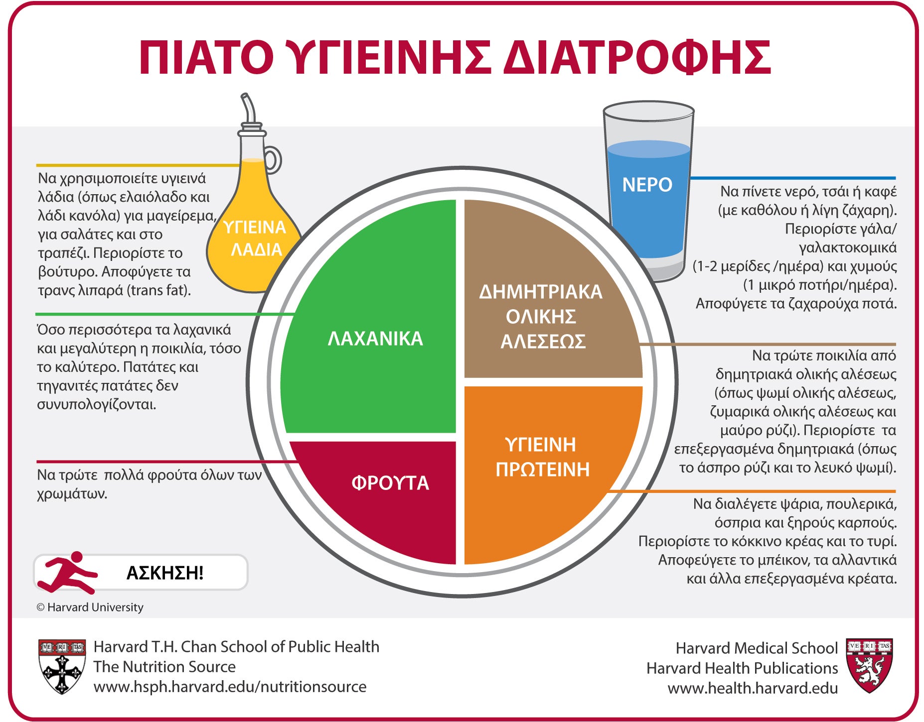 Το Πιάτο Υγιεινής Διατροφής , το οποίο δημιουργήθηκε από εξειδικευμένους επιστήμονες διατροφής στην Σχολή Δημόσιας Υγείας του Πανεπιστημίου Χάρβαρντ καθώς επίσης και από συντάκτες στις Δημοσιεύσεις Υγείας του Πανεπιστημίου Χάρβαρντ (Harvard Health Publications), αποτελεί έναν οδηγό δημιουργίας τόσο υγιεινών όσο και ισορροπημένων γευμάτων – είτε αυτά είναι σερβιρισμένα σε πιάτο είτε συσκευασμένα σε πακέτο. Τοποθετείστε ένα αντίγραφο στο ψυγείο σας, το οποίο θα αποτελεί την καθημερινή σας υπενθύμιση έτσι ώστε να φτιάχνετε υγιεινά και ισορροπημένα γεύματα!