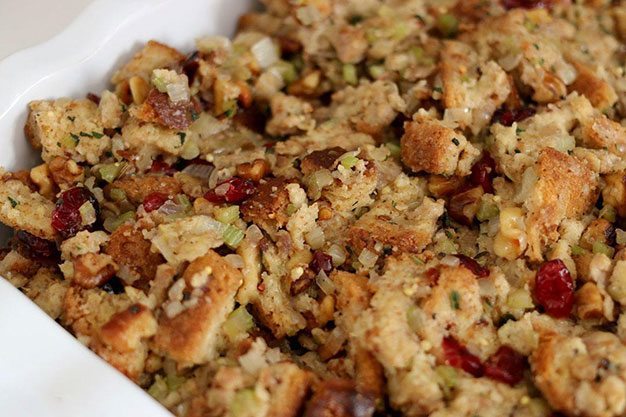 - Add the minced herbs, dried sage, and black pepper, and stir frequently for 30 seconds. Add the bread cubes and another 1-2 tablespoons of olive oil. Cook the bread cubes, stirring constantly, for 5-6 minutes until everything is evenly mixed. Start to add the stock, a little at a time, scraping the bottom of the pan as you do so. Add stock until the bread is nicely moist, but not mushy. When the right consistency is achieved, add the walnuts and cranberries.