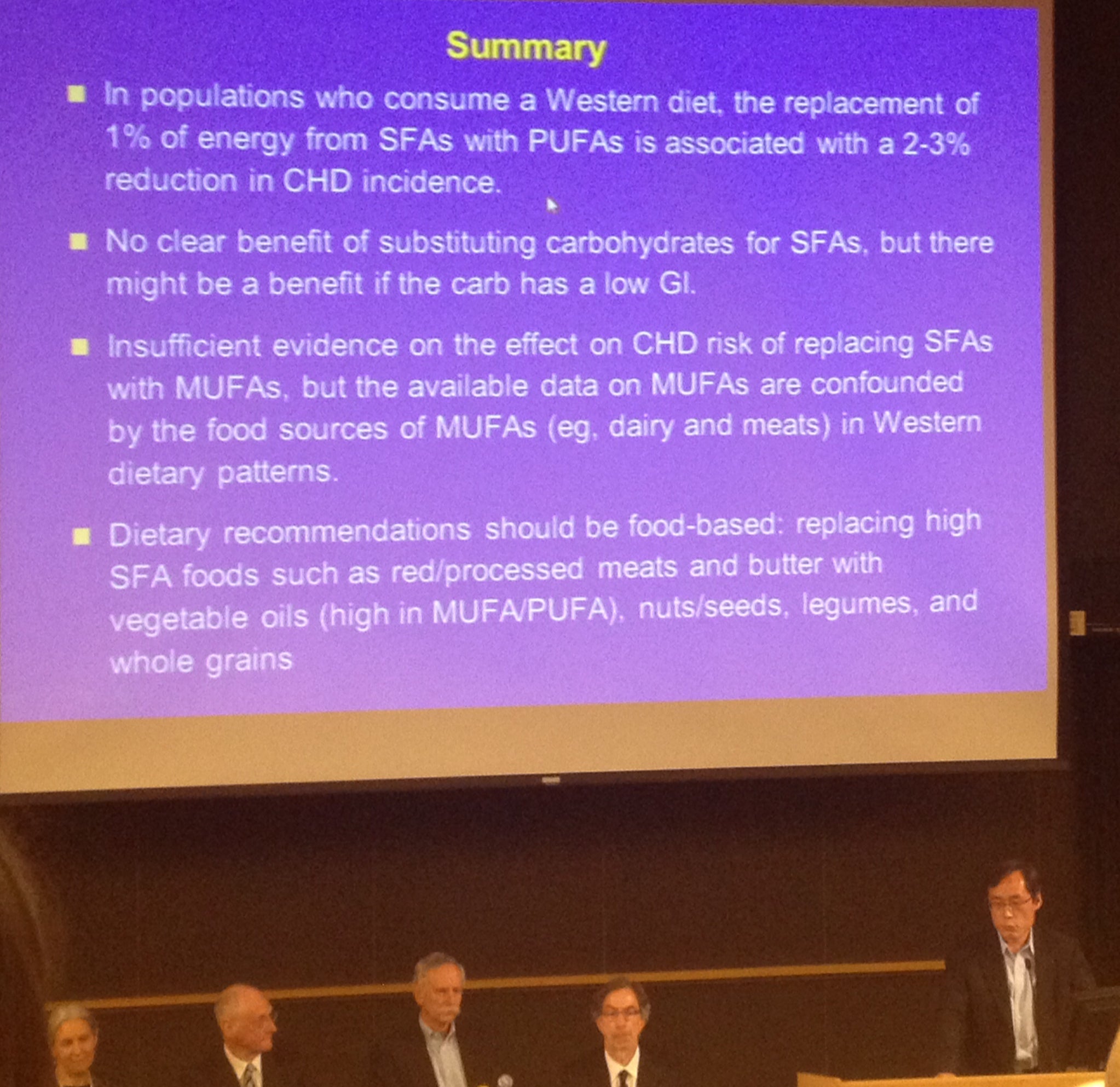 The overarching message was that when it comes to the health values of various fats, it’s about substitution. If you remove one type of fat, what are you replacing it with? Cutting back on saturated fat can be good for health if people replace saturated fat with good fats, especially, polyunsaturated fats. If you remove saturated fat and replace it with refined carbohydrates, there will be a detrimental effect. Moreover, we need to think about food quality – including food sources, and dietary patterns – rather than on nutrients alone.